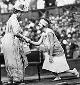 The French tennis player Suzanne Lenglen shakes hands with Queen Mary at the Auteuil Hippodrome in 1926.