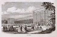 The Bois de Boulogne became a popular meeting place and promenade route for Parisians of all classes. The alleys were filled with carriages, coaches, and horseback riders, and later with men and women on bicycles, and then with automobiles. Families having picnics filled the woods and lawns, and Parisians rowed boats on the lake, while the upper classes were entertained in the cafes. The restaurant of the Pavillon de la Grand Cascade became a popular spot for Parisian weddings. During the winter, when the lakes were frozen, they were crowded with ice skaters.[20]