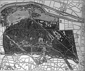 In 1853, Haussmann hired an experienced engineer from the corps of Bridges and Highways, Jean-Charles Adolphe Alphand, whom he had worked with in his previous assignment in Bordeaux, and made him the head of a new Service of Promenades and Plantations, in charge of all the parks in Paris. Alphand was charged to make a new plan for the Bois de Boulogne. Alphand's plan was radically different from the Hittorff-Varé plan. While it still had two long straight boulevards, the Allée Reine Marguerite and the Avenue Longchamp, all the other paths and alleys curved and meandered. The flat Bois de Boulogne was to be turned into an undulating landscape of lakes, hills, islands, groves, lawns, and grassy slopes, not a reproduction of but an idealization of nature. It became the prototype for the other city parks of Paris and then for city parks around the world.[15]