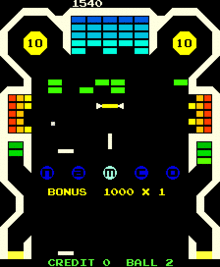 The maximum number of players is two, and the two players have to alternate. The control is a rotary analog stick. The main object of the game is to move two paddles that ricochet a ball which flies around and needs to hit the colored bricks above it. When the bricks are cleared out of the side sections, it will turn that same side's pop-bumper into 100 points instead of 10. It is a bonus multiplier to get the ball to light up the word "NAMCO".[2]