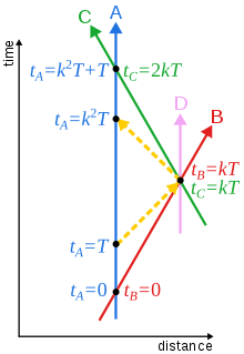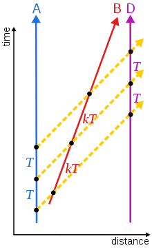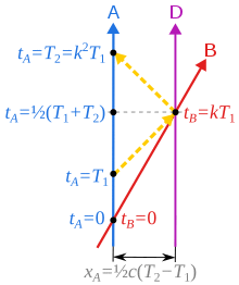 Now suppose that whenever Bob receives a blue flash from Alice he immediately sends his own red flash towards Dave, once every seconds (by Bob's clock). Einstein's second postulate, that the speed of light is independent of the motion of its source, implies that Alice's blue flash and Bob's red flash both travel at the same speed, neither overtaking the other, and therefore arrive at Dave at the same time. So Dave receives a red flash from Bob every seconds, by Dave's clock, which were sent by Bob every seconds by Bob's clock. This implies that the k-factor from Bob to Dave is .[9]