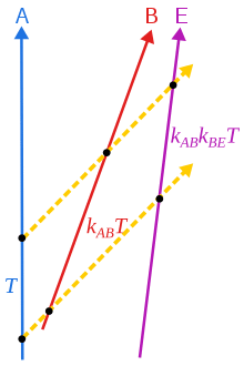 Now suppose that whenever Bob receives a blue flash from Alice he immediately sends his own red flash towards Ed, once every seconds by Bob's clock, so Ed receives a red flash from Bob every seconds, by Ed's clock. Einstein's second postulate, that the speed of light is independent of the motion of its source, implies that Alice's blue flash and Bob's red flash both travel at the same speed, neither overtaking the other, and therefore arrive at Ed at the same time. Therefore, as measured by Ed, the red flash interval and the blue flash interval must be the same. So the rule for combining k-factors is simply multiplication:[18]