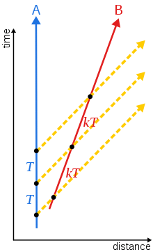 Consider, now, a third inertial observer Dave who is a fixed distance from Alice, and such that Bob lies on the straight line between Alice and Dave. As Alice and Dave are mutually at rest, the delay from Alice to Dave is constant. This means that Dave receives Alice's blue flashes at a rate of once every seconds, by his clock, the same rate as Alice sends them. In other words, the k-factor from Alice to Dave is equal to one.[12]