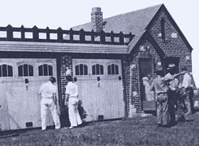 On July 18, 1933, the gang checked into the Red Crown Tourist Court[68] south of Platte City, Missouri (now within the city limits of Kansas City, Missouri across I-29 from Kansas City International Airport). The Red Crown Court was just two brick cabins joined by garages and the gang rented both.[68] To the south stood the Red Crown Tavern, a popular restaurant and a favorite watering hole for Missouri Highway Patrolmen. Once again, the gang seemed to go out of their way to draw attention to themselves:[69] owner Neal Houser became interested in the group immediately when Blanche Barrow registered the party as three guests, and Houser, out his rear window, could see five people exiting their car—which the driver backed into the garage, "gangster style", for a quick getaway.[70] Blanche paid the lodging tab with coins rather than paper money, and did the same thing again later when she purchased five dinners and five beers for, presumably, three guests.[71] The next day, Houser noticed that his guests had taped newspapers over the windows of their cabin, and Blanche once again paid in silver for five meals. Even Blanche's outfit—tight jodhpur riding breeches[72]—attracted undue attention: they were just not the kind of thing the staid women of Platte City would ever wear, and were the first thing mentioned by eyewitnesses reminiscing even 40 years later.[70] It was all too much for Houser, who brought the conspicuous group to the attention of his restaurant patron, Captain William Baxter of the Highway Patrol.[68]