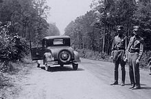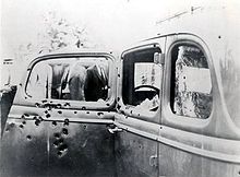 Barrow and Parker were ambushed and killed on May 23, 1934 on a rural road in Bienville Parish, Louisiana.[79][106] The couple appeared in daylight in an automobile and were shot by a posse of four Texas officers (Frank Hamer, B.M. "Manny" Gault, Bob Alcorn and Ted Hinton) and two Louisiana officers (Henderson Jordan and Prentiss Morel Oakley).[107]