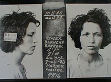 This began to change for Parker after Joplin: the Joplin Police Department issued a Wanted for Murder poster in April 1933 that featured her name and photo first, before Barrow's, though the text concentrated on him.[147] In June, another Wanted for Murder poster emerged, this one out of Crawford County, Arkansas, again with Parker's name and photo getting first billing. There was now a $250 cash bounty attached for either of the "Barrow Brothers" (Clyde and "Melvin")—and the admonition to "inquire of your doctors if they have been called to treat a woman that has been burned in a car wreck."[148]