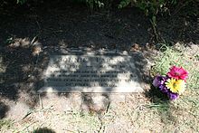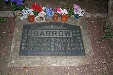 Barrow's family used the Sparkman-Holtz-Brand Morticians,[122] located in the A.H. Belo mansion in downtown Dallas. Thousands of people gathered outside both Dallas funeral homes hoping for a chance to view the bodies. Barrow's private funeral was held at sunset on Friday, May 25, in the funeral home chapel.[118] He was buried in Western Heights Cemetery in Dallas, next to his brother, Marvin. The Barrow brothers share a single granite marker with their names on it and a four-word epitaph previously selected by Clyde: "Gone but not forgotten." In 2013, Bob Phillips in his syndicated television series Texas Country Reporter visited the graves of both Bonnie and Clyde with the theme, "Crime does not pay".[124]