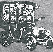 On March 25, 1912, the gang stole a de Dion-Bouton automobile in the Forest of Sénart south of Paris by shooting the driver through the heart.[2] They drove into Chantilly north of Paris where they robbed the local branch of Société Générale Bank – fatally shooting two bank cashiers and severely wounding a bookkeeper.[1] They escaped in their stolen automobile as two policemen tried to catch them, one on horseback and the other on a bicycle.
