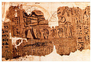 After the fire, however, it was believed that all the sources for the book had been lost.[83] Despite this belief, Abel Combs still owned several papyri fragments and two mummies. While the fate of the mummies is unknown, the fragments were passed to Combs' nurse Charlotte Benecke Weaver, who gave them to her daughter, Alice Heusser. In 1918 Heusser approached the New York Metropolitan Museum of Art (MMA) about purchasing the items; at the time, the museum curators were not interested, but in 1947 they changed their mind, and the museum bought the papyri from Heusser's widower husband, Edward. In the 1960s the MMA decided to raise money by selling some of its items which were considered "less unique". Among these were the papyri that Heusser had sold to the museum several decades earlier.[84] In May 1966, Aziz S. Atiya, a coptic scholar from the University of Utah, was looking through the MMA's collection when he came across the Heusser fragments; upon examining them, he recognized one as the vignette known as Facsmile 1 from The Pearl of Great Price.[84][85] He informed LDS Church leaders, and several months later, on November 27, 1967, the LDS Church was able to procure the fragments,[84] and according to Henry G. Fischer, curator of the Egyptian Collection at the MMA, an anonymous donation to the MMA made it possible for the LDS Church to acquire the papyri.[85] The subsequent transfer included ten pieces of papyri, including the original of Facsimile 1.[86] The eleventh fragment had been given to Brigham Young (then church president) previously by Chief Banquejappa of the Pottawatomie tribe in 1846.[87]