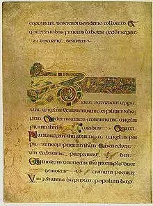 Kells Abbey was plundered and pillaged by Vikings many times in the 10th century, and how the book survived there is not known.[10] The earliest historical reference to the book, and indeed to the book's presence at Kells, can be found in a 1007 entry in the Annals of Ulster. This entry records that "the great Gospel of Columkille, (Columba)[11] the chief relic of the Western World, was wickedly stolen during the night from the western sacristy of the great stone church at Cenannas on account of its wrought shrine".[1][12] The manuscript was recovered a few months later—minus its golden and bejewelled cover—"under a sod".[13] It is generally assumed that the "great Gospel of Columkille" is the Book of Kells.[14] If this is correct, then the book was in Kells by 1007 and had been there long enough for thieves to learn of its presence. The force of ripping the manuscript free from its cover may account for the folios missing from the beginning and end of the Book of Kells. The description in the Annals of the book as "of Columkille"—that is, having belonged to, and perhaps being made by Columba—suggests that the book was believed at that time to have been made on Iona.[15]