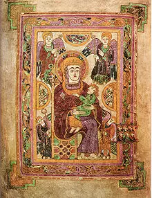 The preliminary matter is introduced by an iconic image of the Virgin and Child (folio 7v). This miniature is the first representation of the Virgin in a Western manuscript. Mary is shown in an odd mixture of frontal and three-quarter pose. This miniature also bears a stylistic similarity to the carved image on the lid of St. Cuthbert's coffin of 698. The iconography of the miniature may derive from an Eastern or Coptic icon.[41]