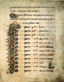 There are two fragments of the lists of Hebrew names; one on the recto of the first surviving folio and one on folio 26, which is currently inserted at the end of the prefatory matter for John. The first list fragment contains the end of the list for the Gospel of Matthew. The missing names from Matthew would require an additional two folios. The second list fragment, on folio 26, contains about a fourth of the list for Luke. The list for Luke would require an additional three folios. The structure of the quire in which folio 26 occurs is such that it is unlikely that there are three folios missing between folios 26 and 27, so that it is almost certain that folio 26 is not now in its original location. There is no trace of the lists for Mark and John.[28]
