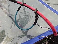 When a sailor falls and must recover to a sailing position, the boom is sometimes used in one of the initial steps of performing a waterstart. When the sail is first lifted from the water, it often helps to push the back of the board slightly underwater, and then setting the front of the boom onto the board (near the footstraps). The buoyancy of the board will then push the boom upward, helping to lift the sail out of the water.[1][2][3][4][5]
