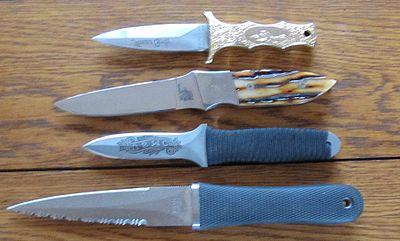 A boot knife or a gambler's dagger is a small fixed-blade knife (usually, a dagger) that is designed to be carried in or on a boot.[1] Typically, such a knife is worn on a belt or under a pant leg.[2] If worn around the neck (by means of a chain or lanyard) they become a neck knife. Boot knives generally come with a sheath that includes some form of a clip. Most have double-edged blades, like a dagger, that range from 3 to 5 inches (7.62 to 12.7 cm).[2]