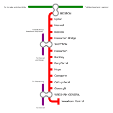 | Stations | 15 with Wrexham General and Shotton as interchanges with main line services | ||||||||||||||||||||||||||||||||||||||||||||||||||||||||||||||||||||||||||||||||||||||||||||||||||||||||||||||||||||||||||||||||||||||||||||||||||||||||||||||||||||||||||||||||||||||||||||||||||||||||||||||||||||||||||||||||||||||||||||||||||||||||||||||||||||||||||||||||||||||||||||||||||||||||||