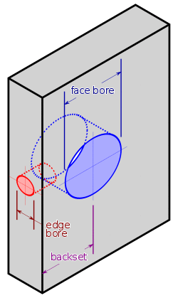 In the United States, typically, the face bore is sized from 1.5 to 2.125 inches (3.81 to 5.40 cm) in diameter and is centered at 2.375 or 2.75 inches (6.03 or 6.99 cm) from the leading edge of the door. This distance is referred to as the "backset."[3] Other, less popular, backsets are at 3.75 and 5 inches (9.5 and 12.7 cm). Residential doors are normally prepared with a 2.375-inch (6.03 cm) backset and commercial doors have a 2.75-inch (7.0 cm) backset. The edge bore is typically centered on the edge.