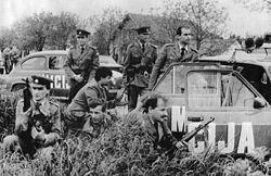 Twelve Croatian policemen were killed and 21 injured in the ambush.[6] The two captured policemen were ferried across the Danube and transported to Novi Sad, but were released and returned to Osijek by the evening of 2 May.[26] Vojislav Milić, a paramilitary from Valjevo, was the only fatality among the Serb militia.[27] Four other paramilitaries were wounded.[28] Some of the police killed at Borovo Selo were found to have been mutilated, their ears cut, their eyes gouged out and their throats slit.[24][16] These acts were meant to inflame ethnic hatred.[29]
