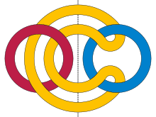 It is common in mathematics publications that define the Borromean rings to do so as a link diagram, a drawing of curves in the plane with crossings marked to indicate which curve or part of a curve passes above or below at each crossing. Such a drawing can be transformed into a system of curves in three-dimensional space by embedding the plane into space and deforming the curves drawn on it above or below the embedded plane at each crossing, as indicated in the diagram. The commonly-used diagram for the Borromean rings consists of three equal circles centered at the points of an equilateral triangle, close enough together that their interiors have a common intersection (such as in a Venn diagram or the three circles used to define the Reuleaux triangle). Its crossings alternate between above and below when considered in consecutive order around each circle;[1][2][3] another equivalent way to describe the over-under relation between the three circles is that each circle passes over a second circle at both of their crossings, and under the third circle at both of their crossings.[4] Two links are said to be equivalent if there is a continuous deformation of space (an ambient isotopy) taking one to another, and the Borromean rings may refer to any link that is equivalent in this sense to the standard diagram for this link.[3]