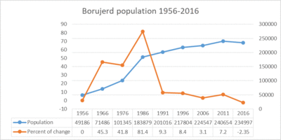 Borujerd City has 256,962 inhabitants (estimated for 2006) and it is the 31st largest city in Iran and the 2nd largest in Lorestan [1]. Borujerd is the industrial point of Lorestan. Its historical and cultural background as well as its remarkable nature, has changed it to a tourist destination. The city is well-structured with live nights and many shops and markets. Borujerdi people are easygoing and tolerant and different religious minorities such as Jews, Sufism and Baháʼí Faith have grown there. The city has been named as Dār-Al-Sorur which means the house of happiness. Today, Borujerd is sometimes referred to as Paris Kučulu namely the little Paris. Borujerd population was estimated about 20000 in mid-1800s. Official statistics by