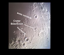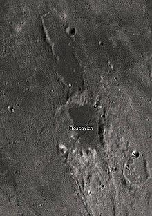 Boscovich is a lunar impact crater that has been almost completely eroded away by subsequent impacts. It is located west-northwest of the crater Julius Caesar, and south-southeast of the prominent Manilius. The crater floor has a low albedo, and the dark hue makes it relatively easy to recognize. The surface is crossed by the rille system designated Rimae Boscovich that extends for a diameter of 40 kilometres. The crater is named after Croatian physicist Roger Joseph Boscovich.[1]