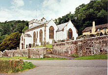 On the hill above the village is the whitewashed 15th-century Church of All Saints, with a 14th-century tower. The pulpit includes a 17th-century hourglass and the iron-bound parish chest dates from the same time.[19] Within the church is a copy of the Chained Book of 1609 by Bishop John Jewel, entitled Defense of the Apologie of the Church of England.[20]