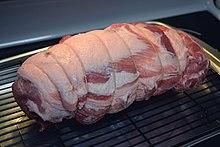 A Boston butt is the slightly wedged shaped portion of the pork shoulder above the standard picnic cut[1] which includes the blade bone and the "lean butt" (which is boneless), both extensions of the tenderloin cut and can be used in place of the tenderloin.[2] Generally the pork shoulder is considered a primal cut with the picnic and butt sections being sub-primal cuts however, some sources do refer to the butt as a primary cut.[3]