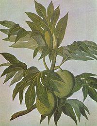 A third-generation clone of a breadfruit tree in the twenty-first century collection of the gardens came from an original plant brought in 1793 by Captain William Bligh (of Bounty fame).[1] In 1787-88 Captain Bligh made his ill-fated voyage on the HMS Bounty to Tahiti to collect breadfruit and other useful plants for the West Indies.[3] Undaunted by the notorious mutiny of his first crew, Bligh again set sail for Tahiti aboard HMS Providence. He completed his mission in Kingstown, St. Vincent on January 23, 1793 with plants from the South Seas.[4] The Botanic Garden's Curator Alexander Anderson took great care of these plants, and the success of all those efforts is evident from the widespread distribution of breadfruit, the most useful food plant throughout the West Indies.