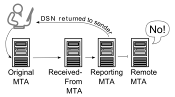 The remaining bounces with an empty Return-Path are non-delivery reports (NDRs) or delivery status notifications (DSNs). DSNs can be explicitly solicited with an SMTP Service Extension (ESMTP), however it is not widely used. Explicit requests for delivery failure details is much more commonly implemented with variable envelope return path (VERP), while explicit requests for them are rarely implemented.[6]