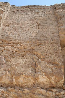 Stelae K, M, and X on the east side of the Nile contain what Davies termed the Earlier Proclamation.[5] All three stelae contain both vertical and horizontal lines of text. Stela K is the best preserved[8] and was made to replace Stela M which was damaged early on, thus necessitating a replacement.[9] Both Stela K and Stela M are located in the southern side of the site and the text in their horizontal lines reads from left to right, away from the center of the site. Stela X is located in the northern side of the site and it is a mirror image of stelae K and M in that its horizontal lines read from right to left, also away from the center.[8] The inscription on the stelae K, M, and X is dated to the fifth regnal year of Akhenaten in day 13 of the season of Peret. They include the full title of the god Aten, as well as titles of the king Akhenaten and the king's wife Nefertiti. The stelae also describe the founding of the site by the pharaoh, reasons for choosing it, the proposed layout of the site, instructions regarding the burials of the royal family and certain notables, and instructions for the maintenance of the cult of Aten.[10] The Earlier Proclamation also includes a promise from Akhenaten to build various temples and other structures to the god Aten in the location.[11] The latter part of the text is fragmentary and has inspired a variety of interpretations.[12]
