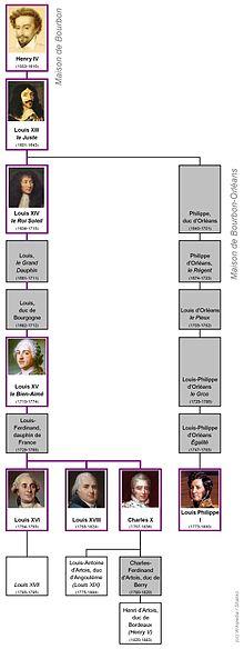 ![]() Louis XVI ![]() (1774–91) ![]() the French (1791–92) Titular King of France (1792–93) | ![]() Louis XVIII ![]() King of France (1795–1804) Legitimist pretender (1804–14) ![]() (1814–24) | ![]() Charles X ![]() (1824–30) Legitimist pretender (1830–36) | ![]() Ferdinand VII ![]() (1808; 1813–33) | Francisco de Paula | Carlos Count of Molina as Carlos V ![]() pretender (1833–45) | Louis I![]() (1801–03) | ![]() Louis-Philippe I ![]() the French (1830–48) Orléanist Pretender (1848-50) | ||||||||||||||||||||||||||||||||||||||||||||||||||||||||||||||||||||||