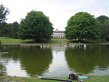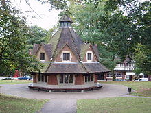 The Cadburys were particularly concerned with the health and fitness of their workforce, incorporating park and recreation areas into the Bournville village plans and encouraging swimming, walking and indeed all forms of outdoor sports.[7] In the early 1920s, extensive open lands were purchased at Rowheath and laid to football and hockey pitches together with a grassed running track. Rowheath Pavilion was designed and built in accordance with the instructions of George Cadbury and opened in July 1924. At that time, it served as the clubhouse and changing rooms for the acres of sports playing fields, several bowling greens, a fishing lake and an outdoor swimming lido, a natural mineral spring forming the source for the lido's healthy waters. The Rowheath Pavilion itself, which still exists, was used for balls and dinners and the whole area was specifically for the benefit of the Cadbury workers and their families with no charges for the use of any of the sporting facilities by Cadbury employees or their families. The lido was eventually closed in the 1970s after complaints of noise disturbance were made by residents of the newly built Oak Farm estate, coupled with new and stringent health and safety regulations relating to outdoor public swimming facilities. Cadbury's also built the Bournville indoor swimming baths on Bournville Lane (separate buildings for 'girls' and men), the Valley pool boating lake and the picturesque cricket pitch adjacent to the factory site, that was made famous as the picture on boxes of Milk Tray chocolates throughout the 1950s and early 1960s.