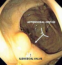 The bow and arrow sign uses the curve of the appendiceal orifice to point toward the direction of the ileocecal valve, as if it were a bow guiding an arrow. The colonoscope can be passed in this direction in order to enter the terminal ileum.[1] This is used as one of two identifiable landmarks of the colon (the other being the anus), and signifies that the entire colon has been visualized.