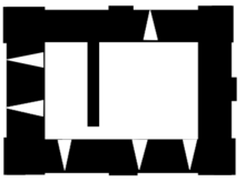 The rebuilt castle featured a hall-keep, an uncommon design in English castles; built of stone, this was a three-storied structure 82 feet (25 m) long, 60 feet (18 m) wide and 50 feet (15 m) high.[10] Internally the keep was divided to form a long hall and a solar and was lit by large, rounded windows.[11] The keep had architectural similarities to various nearby castles in the region, but in particular to those at Middleham and Outhgill.[12] A ditch formed an inner defensive bailey around the keep, with the ramparts of the old fort forming a larger, outer bailey.[13] A mill, then an essential part of any castle, was built by the River Greta to supply flour for the garrison .[14] The village of Bowes was built after the castle and formed a planned site running up to the castle, complete with a church and a market place; this form of planned village is again unusual in England.[15]