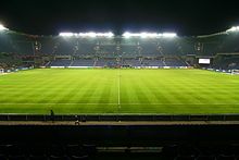 When all four stands had been erected in 1992, the pitch could be expanded and reshaped, which happened in 1996.[72] On the same occasion, heat pipes and a new, specialised irrigation system were laid under the new grass playing surface.[72] In addition to the improved pitch, new floodlights were installed on the roof of the west and east stands,[20] in order for the lighting to meet the international requirements.[72]