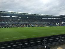 The connected upper stands meant that the corners of the stadium became partly enclosed, and toilet stalls as well as food and drink outlets were placed in the spaces between the lower and upper stands.[42] The new upper stands included 13,600 new seats, increasing the total capacity to 31,500 spectators.[38] For international matches, capacity was limited to 26,500 spectators as they demand all-seated crowds.[38] The entire redevelopment progressed while the club still played its home games at the stadium, and the original changing rooms under the main grandstand, originating from 1978, were retained.[42]