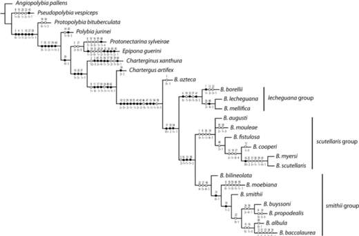 Brachygastra azteca is considered to be the most basal species, and a sister species to all others in the genus.[7] The rest of the genus Brachygastra has historically been divided into two main groups consisting of closely related species. The lecheguana group consists of B. mellifica, B. lecheguana, and B. borellii, and the smithii group of B. baccalaurea, B. bilineolata, B. smithii, B. propodealis, and B. buyssoni.[2] The scutellaris group, containting B. augusti, B. mouleae, B. fistulosa, B. cooperi, B. myseri and B. scutellaris, is composed of the remaining species that are apparently less closely related and not able to be placed in either of the previous groups.[7] These three groups are bound within a clade by shared characteristics of the scutellum. It is strongly angular, projects over the metanotum and is medially emarginated, usually in a V-shape.[2]