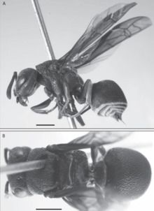 Species are easily recognised by the very high scutellum that often projects over the metanotum. The Metanotum and propodeum forms a flat, vertical posterior surface of the mesosoma. The abdomen is often described as truncate due to being wider than it is long.[6][3][7] Variation in the size and density of punctures on different parts of the body has been used to describe and identify species, subspecies, and forms of the genus.[2]