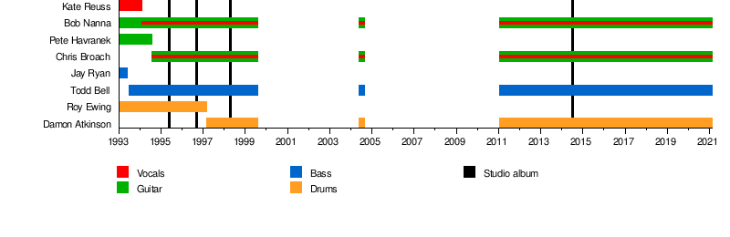 Following several early line-up changes, the band eventually settled on Bob Nanna on guitar and vocals, Todd Bell on bass, Chris Broach on guitar and vocals, and Roy Ewing on drums until he was replaced in 1997 by new drummer Damon Atkinson.