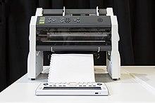 The fastest industrial braille embosser is probably the $92,000 Belgian-made NV Interpoint 55, first produced in 1991, which uses a separate air compressor to drive the embossing head and can output up to 800 braille characters per second. Adoption was slow at first; in 2000 the National Federation of the Blind said there were only three of these in the US, one owned by the NFB itself and the other two by the Watchtower Bible and Tract Society.[1] As of 2008 there are more than 60 in use across the world.[2]