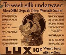 From the first decades of the 20th-century, advertisers began to focus on developing brand personality, brand image and brand identity—concepts. The British advertising agency, W. S. Crawford's Ltd, began to use the concept of 'product personality' and the 'advertising idea' arguing that in order to stimulate sales and create a 'buying habit', advertising had to 'build a definitive association of ideas round the goods'. In the US, advertising agency, J. Walter Thompson company (JWT), was pioneering similar concepts of brand personality and brand image. The notion of a 'brand personality' was developed independently and simultaneously in both the US and Britain.[34] For example, in 1915 JWT acquired the advertising account for Lux soap and recommended that the traditional positioning as a product for woolen garments should be broadened so that consumers would see it as a soap for use on all fine fabrics in the household. To implement, Lux was repositioned with a more up-market posture, and began a long association with expensive clothing and high fashion. Cano has argued that the positioning strategy JWT used for Lux exhibited an insightful understanding of the way that consumers mentally construct brand images. JWT recognised that advertising effectively manipulated socially shared symbols. In the case of Lux, the brand disconnected from images of household drudgery, and connected with images of leisure and fashion.[35]