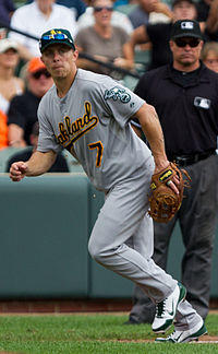 Inge agreed to sign with the Oakland Athletics on April 29, 2012 on a $5.5 million deal.[27] The signing provided infield depth for Oakland, who lost Scott Sizemore to a knee injury. He initially wore number 18, but switched to number 7 after a few games (his old #15 was worn by teammate Seth Smith). In his first game against the Tigers a week later, Inge hit a grand slam. On September 1, after dislocating his shoulder for the second time within a month, Inge was forced to undergo season ending shoulder surgery.[28]