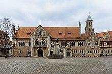 - The Burgplatz (Castle Square), comprising a group of buildings of great historical and cultural significance: the Cathedral (St Blasius, built at the end of the 12th century), the Burg Dankwarderode (Dankwarderode Castle) (a 19th-century reconstruction of the old castle of Henry the Lion), the Neo-Gothic Town Hall (built in 1893–1900), as well as some picturesque half-timbered houses, such as the Gildehaus (Guild House), today the seat of the Craftsman's Association. In the centre of the square stands a copy of the Burglöwe (Brunswick Lion), a Romanesque statue of a Lion, cast in bronze in 1166. The original statue can be seen in the museum of Dankwarderode Castle. Today the lion has become the true symbol of Braunschweig.