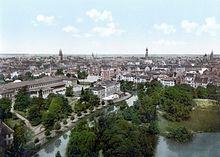 During the 19th century, industrialisation caused a rapid growth of population in the city, eventually causing Brunswick to be for the first time significantly enlarged beyond its medieval fortifications and the River Oker.[18] On 1 December 1838, the first section of the Brunswick–Bad Harzburg railway line connecting Brunswick and Wolfenbüttel opened as the first railway line in Northern Germany, operated by the Duchy of Brunswick State Railway.[19][20]