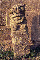 A sculpted stone stands in the churchyard, at the west end of the church, close to the tower. Known as the Braunston "Goddess", it was found in about 1920 when the church doorstep needed to be replaced. When the slab was lifted the carving was revealed on the underside. There has been considerable speculation as to its age and meaning, and its original position as part of the church building, or whether it may even predate the church. It is clearly not a gargoyle as it has no drainage channel. It may have had an apotropaic purpose. It has facial and stylistic similarities with some Irish Sheela na Gigs, but it has no genitalia.