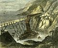 The Dublin-Wicklow railway line runs outside of Bray Head along the coast, sometimes travelling within feet of the cliffs. This line, designed by Isambard Kingdom Brunel, is referred to as Brunel's Folly, due to the ongoing maintenance costs associated with maintaining a cliff-face line. The line had to be diverted on three occasions in 1876, 1879, and 1917.[3] A serious accident occurred on 9 August 1867 when a passenger train derailed on nearby Brandy Hole Viaduct, causing the deaths of two passengers.[4] The rail trip between Dublin and Bray Daly railway station, the nearest station to Bray Head, takes approximately 45 minutes.