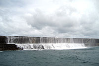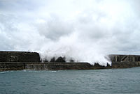 The 3,000 feet (910 m) breakwater at Braye Harbour was built by the British to protect ships of the Navy between 1847 and 1864. Originally, two arms were planned as a protection to the harbour from the tidal race of The Swinge, but only the western arm was completed due to improving relations with the French. When construction stopped the breakwater was 4,827 feet (1,471 m) long, but within a year 1,780 feet (540 m) was abandoned to the sea following heavy gales.[13] It gives only partial protection to the harbour, as during storms the breakwater suffers damage and is constantly repaired and maintained. Financial assistance for maintenance was provided by the UK until the 1980s, and since then by Guernsey in lieu of defense payments required to maintain The Bailiwick of Guernsey's status as a British Crown Dependency. The massive stone breakwater is generally used as a walk way to enjoy the scenic beauty of the bay, its harbour and the sea.[4] The breakwater is now termed as "Victorian" and it provides safety to yachtsmen who sail in the harbour.[3]