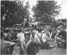 The first mention of the phrase and its meaning appears in The American Magazine in September 1911. In an article by Helen Todd, she describes how a group of women from the Chicago Women's Club, after listening to advice from Senator Robert La Follette, decided to initiate an automobile campaign around the state of Illinois for the right of women to vote in June 1910.[5] The women who made up the first automobile campaign were Catherine McCulloch, a lawyer and justice of the peace; Anna Blount, a physician and surgeon; Kate Hughes, a minister; Helen Todd, a state factory inspector; and Jennie Johnson, a singer. Each of the speakers was assigned a subject in which they were an expert. McCulloch gave a record of the votes of the representatives and senators to their home constituents. Blount's subject was taxation without representation as concerns women. Hughes gave her speech on the history of the women's suffrage movement. Johnson opened up the speeches with a set of suffrage songs which was intended to focus and quiet the audience for the subsequent speeches. Helen Todd, as a factory inspector, represented the working women and discussed the need for laws concerning wages, work conditions, and hours.[6][7][8]