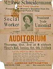 In May 1912, Merle Bosworth gave a speech in Plymouth, Indiana on women suffrage in which she repeated the discussion of taxation without representation and the meaning of the phrase "Bread and Roses" that Helen Todd and her companions gave in 1910 during their automobile campaign for the women's suffrage.[27] A month later in June 1912 Rose Schneiderman of the Women's Trade Union League of New York discussed the phrase in a speech she gave in Cleveland in support of the Ohio women's campaign for equal suffrage.[28] In her speech, which was partially published in the Women's Trade Union League journal Life and Labor, she stated: