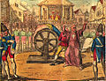 - ^ Blazek, Matthias: „Letzte Hinrichtung durch Rädern im Königreich Preußen am 13. August 1841“ (In the Kingdom of Prussia a criminal was broken upon the wheel for the last time on 13 August 1841), in: Fachprosaforschung – Grenzüberschreitungen. Deutscher Wissenschafts-Verlag (DWV), Baden-Baden, ed. 7, 2011, p. 339–343. Burrill, Alexander (1870). A Law Dictionary and Glossary. 2 (2nd ed.). New York, NY: Baker Voorheis and Co. p. 620. Retrieved 21 March 2010. Rudolf Kühnapfel, assassin of Andreas Stanislaus von Hatten, the Bishop of Warmia, was sentenced to be executed in this manner, though he was killed by strangulation before his corpse was broken on the wheel.