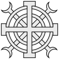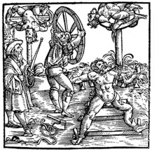 Alternatively, the condemned were spreadeagled and broken on a saltire, a cross consisting of two wooden beams nailed in an "X" shape,[6][7] after which the victim's mangled body might be displayed on the wheel.[8]